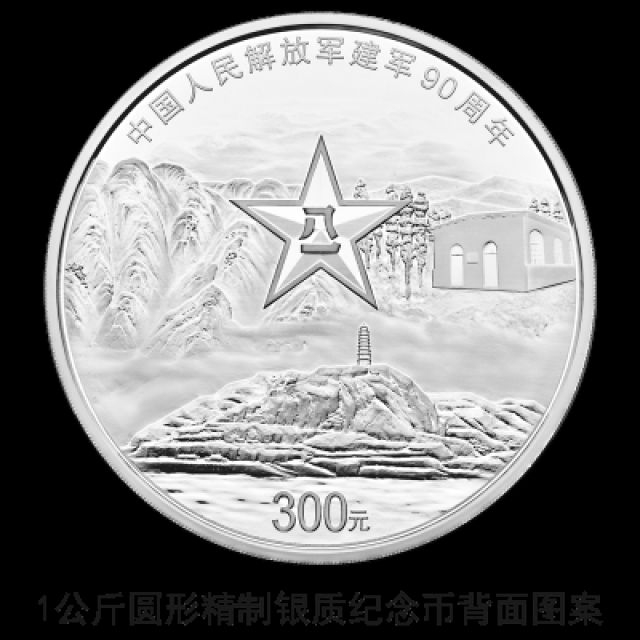 1公斤圆形银质纪念币背面图案为八一军徽配以井冈山、延安宝塔山、西柏坡典型造型组合设计,并刊“中国人民解放军建军90周年”字样及面额。