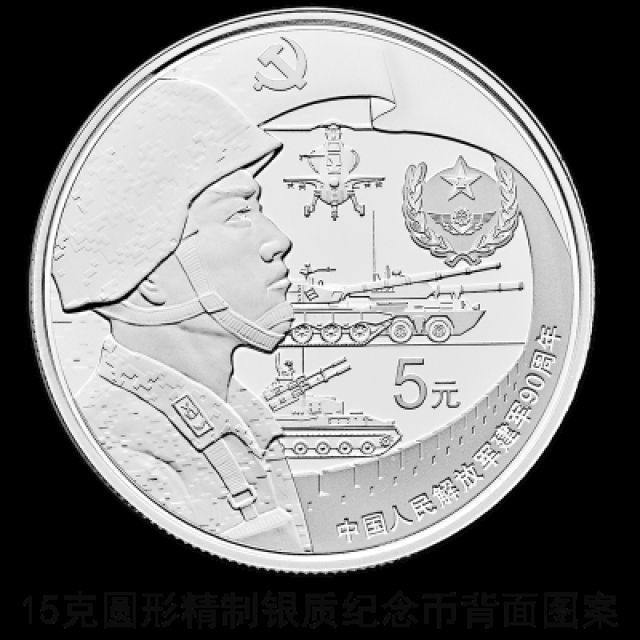 15克圆形银质纪念币背面图案之一为党旗下的陆军军人形象配以典型武器装备、军兵种臂章图案、长城造型等组合设计,并刊“中国人民解放军建军90周年”字样及面额。