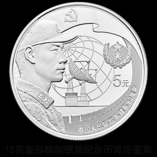 15克圆形银质纪念币背面图案之五为党旗下的战略支援部队军人形象配以典型武器装备、军兵种臂章图案、长城造型等组合设计,并刊“中国人民解放军建军90周年”字样及面额。