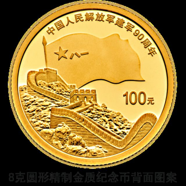 8克圆形金质纪念币背面图案为军旗、长城造型组合设计,并刊“中国人民解放军建军90周年”字样及面额。