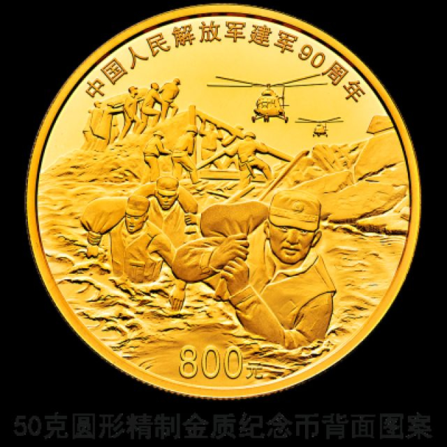 50克圆形金质纪念币背面图案为解放军官兵和武警官兵抢险救灾场景,并刊“中国人民解放军建军90周年”字样及面额。