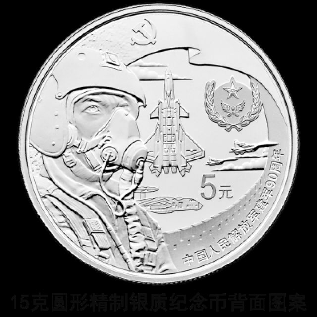 15克圆形银质纪念币背面图案之三为党旗下的空军军人形象配以典型武器装备、军兵种臂章图案、长城造型等组合设计,并刊“中国人民解放军建军90周年”字样及面额。