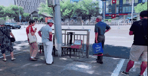 ——山东工商学院的范海柱把零钱箱放到烟台的某公交车站,一位穿红色上衣的阿姨看到零钱箱,把自己口袋里的零钱放了进去。这让已经又渴又累的范海柱觉得“非常开心”。
