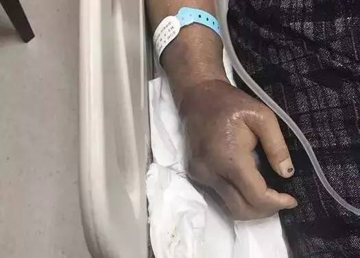来的时候,朱女士的意识还是清醒的,她的右手从手背到手肘肿的很厉害,皮肤颜色呈暗青色,还有许多水泡,有些水泡已经破溃流脓。急诊医生检查发现,朱女士右手虎口处有破溃,伤口大面积感染,白细胞急剧下降,已经发展脓毒血症,很快陷入了昏迷状态。