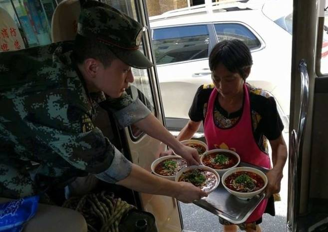 9日早7时30分左右,乐山消防赴九寨沟地震救援官兵途经绵阳市平武县城。由于前方车辆拥堵,官兵只得原地待命,等待疏通。饭店的一位孃孃端来几碗热腾腾的牛肉刀削面,不管官兵如何推辞,就是要让战士们吃下:“你们远道而来,辛苦了”。