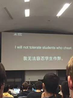 7日,在澳大利亚国立大学IT专业的课堂上,澳籍教师史蒂夫突然放出一张幻灯片,上面用英文下面用中文写着:“我无法容忍学生作弊”。