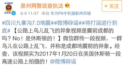 九寨沟震前现“黑鸟乱飞”异象?又是谣言!