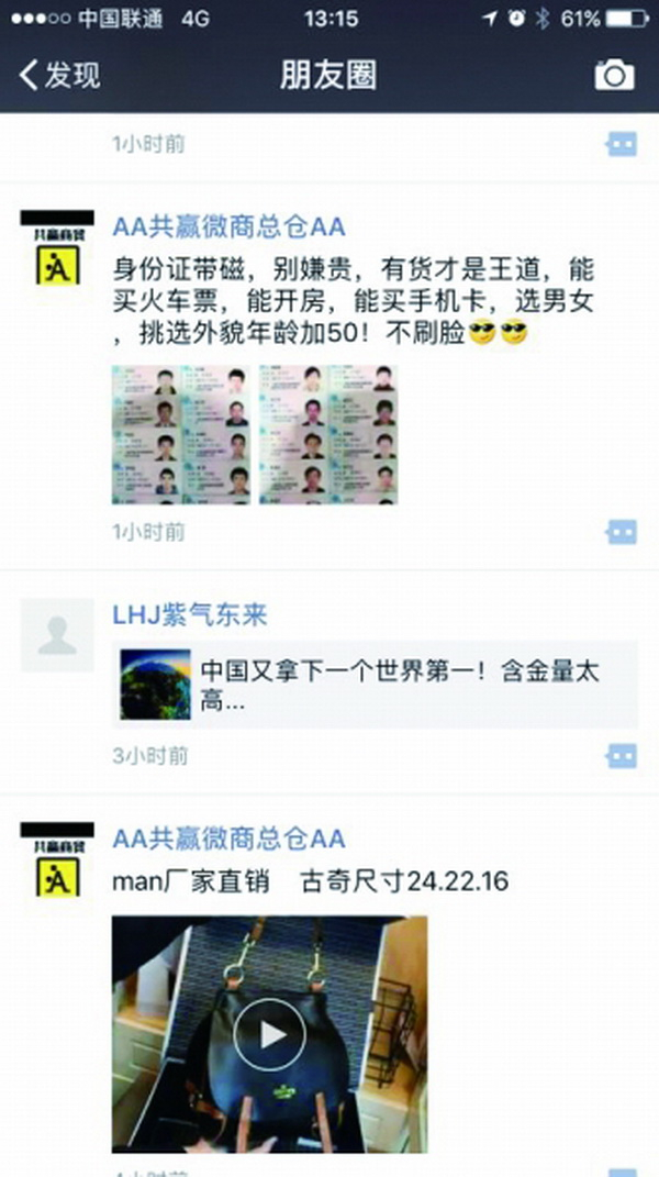 2017年初,一个微信号为“LC11827”的微商加记者微信,其微信名为“AA共赢高端总仓AA”(以下简称“共赢”)。这位名叫“共赢”的微商经营的范围非常广泛,从各种高档香烟到奢侈名表、包包;从各类管制刀具到假车牌;从成人用品到儿童玩具,各种商品包罗万象。不过很多时候就连微商主人自己都承认所售商品系仿冒,不过,有种商品这名商家敢拍着胸脯说这是“真的”,这款产品就是——“身份证”。