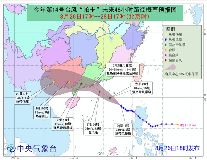 今年第14号台风“帕卡”(热带风暴级)的中心今天(26日)下午5点钟位于广东省台山市东偏南方大约670公里的南海东北部海面上,中心附近最大风力9级(23米/秒),中心最低气压为990百帕,七级风圈半径150-180公里。
