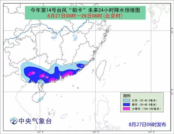 “帕卡”(强热带风暴级)03时中心位于北纬20.9度、东经114.9度,距离珠海市东偏南方向约217公里。中山市气象局27日4时11分将台风预警信号升级为红色。