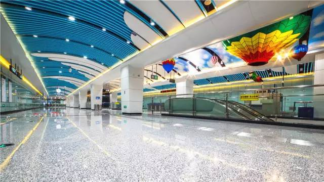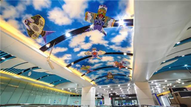 双流机场1航站楼站给人惊喜的地方在于,在车站公共艺术设置方面突破以往传统墙面壁画形式,就是大家常见的主题文化墙,这次在站厅楼梯位置天花吊顶做“装置艺术”作品,内容以“飞翔”主题展示蓝天白云、飘扬气球、放飞纸鸢等素材,立体、形象的契合了装修的整体空间效果,浑然一体、美轮美奂,不仅让历史文脉得以延续,更寓意着“吉祥平安、腾飞顺达”的美好愿景,完美定义10号线装修设计的独到之处。