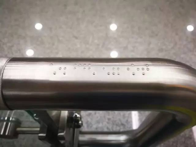 在上下楼梯扶手处设置凸出盲文,方便盲人乘客触碰感知,判断上下行方向,确保安全