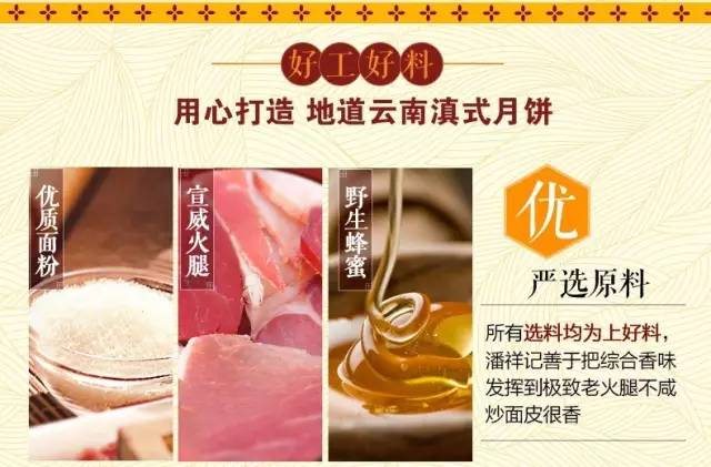 以一贯真材实料的经营传统,以特制要求,以摸高心态,用高于通常选材的标准优中选优,以上好宣威火腿为主要食材,精心烤制而成,力图以最佳口味的云腿月饼回报三迤父老乡亲。