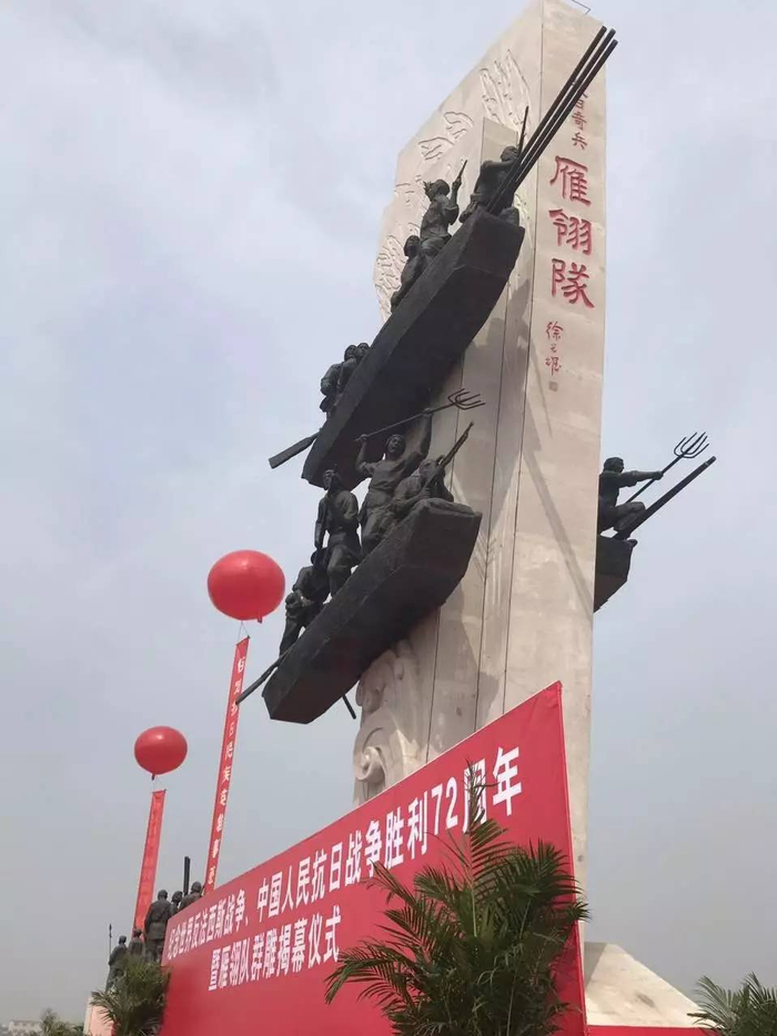 9月3日,纪念世界反法西斯战争、中国人民抗日战争胜利72周年暨雁翎队群雕揭幕仪式在保定举行。白洋淀雁翎队群雕由中国雕塑学会副会长郭宝寨教授组织精干的专业团队精心设计创作而成。昨日,记者在仪式现场看到,白洋淀雁翎队群雕由主雕和辅雕两部分组成,主雕高16米,群雕全长22.5米。其中,主雕寓意飘动的芦苇荡似点燃的火炬高高竖起,三艘载有手持洋枪土炮的雁翎队队员冲向敌人。主雕正面为小说《小兵张嘎》的作者徐光耀书写的“抗日奇兵雁翎队”几个大字,辅雕体现了军民鱼水情。(燕赵都市报)