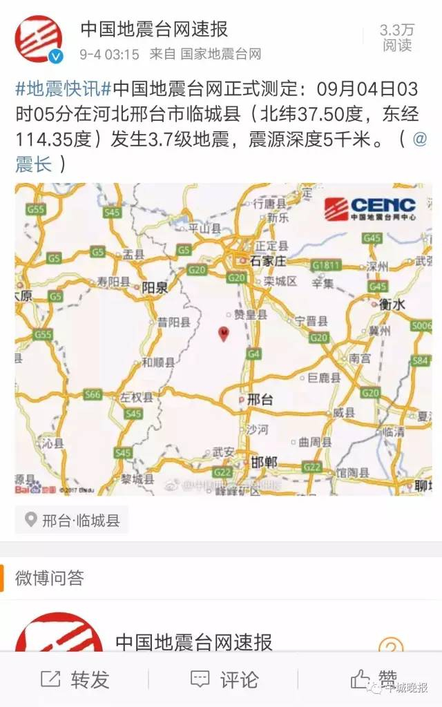 国家地震台网官方微博@中国地震台网速报 9月4日03:15发布消息: #地震快讯#中国地震台网正式测定:09月04日03时05分在河北邢台市临城县(北纬37.50度,东经114.35度)发生3.7级地震,震源深度5千米。