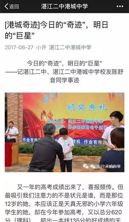 7岁读中学,2011年考取湛江二中港城中学,就读初一;这时候,很多同龄人在读小学一年级;