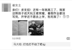 本报讯(华商晨报主任记者 刘桐)暑假中学生们都干什么啦?开学后,学生在说完成作业的同时,很多学生都会谈到“王者荣耀”。 昨日,崔女士就在微信朋友圈中晒出了儿子玩网游的截屏,还有一张没完成的作业图片:“还有一年就高三了,我家这熊孩子成天玩王者荣耀,暑假作业都没写完,开学还不愿去上学,愁死我了!” 发出朋友圈后,引来了许多“同病相怜”家长们的围观,不少人也在反映自家熊孩子的问题。 孩子假期玩王者荣耀常到凌晨 新学期开学已经第三天了,崔女士的儿子张熙(化名)还没从暑假生活节奏中调整出来。前一天晚上张熙还沉浸在王者荣耀的网络游戏中不能自拔,第二天不愿意起床,甚至还说“不想去上学!不参加高考也行”之类的话。 儿子这话对崔女士简直就是晴天霹雳,“常说玩物丧志,没想到自己孩子成为这样不上进的人。” 结果发出朋友圈后,引来了许多“同病相怜”家长们的围观,不少人也在反映自家熊孩子的问题。一位网友将崔女士的烦恼发送给了本报官方微信,想通过本报获得更为专业的解决方法。 假期结束后不愿上学 昨日,记者联系到崔女士本人。崔女士说:“我儿子是重点中学的学生,开学就高二了,学习成绩中游水平,班主任老师说假期抓一抓学习,高二很关键,如果冲上去高三再稳定住,就能考上一个还不错的大学,要是高二水平下来,这成绩可就没法保证了。” 但崔女士没想到的是,暑假期间,儿子张熙却以学习紧张,假期适当放松为由,和班级同学一起玩上王者荣耀的网络游戏。 “从此孩子就不能自拔,每天自己在屋子里面玩游戏,从早上我出门一直到晚上下班还在玩,甚至常常直到凌晨还沉浸其中。这两天精神也是萎靡不振。我要是说多了,就一摔门进屋了。要是问急眼了,就说我不去上学了,不参加高考也能挺好,现在就想去当导游,挺自由的!”崔女士焦急地说。 ■对话家长 孩子视力下降 打不起精神学习 采访中,家长崔女士一直表现得很焦灼,甚至还抱怨:“这孩子就是不争气,还有就是王者荣耀可把孩子们都坑了!” 记者:什么时候发现孩子在假期玩王者荣耀的? 崔女士:之前我儿子也上网看看新闻、视频、电影,偶尔会玩会儿网络游戏,但是玩一会就放下不玩了。 在今年暑假刚开始,我儿子经常傍晚和同学约好打篮球,可能就是这个时候他同学向他介绍了王者荣耀这款网络游戏。开始的时候白天还能看书做题,也就是晚饭后才会玩一会儿,他说是学习时间长了,换换脑子,放松一下。后来就沉浸其中,不能自拔。 每天我早上出门上班前,看到他起来就坐在电脑前玩游戏,下班回来的时候还是坐在那里一动不动的玩。甚至我早上做完的饭摆在桌子上,他一筷子都没动,一天都不吃饭,就在那里玩。 记者:对于孩子沉迷于网游的情况,有没有和孩子谈谈心?或者带着孩子干点其他事儿转移注意力? 崔女士:每当看到他玩网络游戏的时候,我就气不打一处来,既着急又生气。后来他更夸张,嫌在电脑前玩游戏我总说他,就开始用手机继续玩。他倒是能够坐在书桌前,但是根本没学习,而是低头专心玩游戏,令我感到很“揪心”。 开始我和他谈,他还能停一会儿应付应付我,但是后来对我不太爱搭理了,总说“就这一局,玩完了再看书”,但是这一局却没完没了。现在我要是说他,他还会很逆反地怒怼我。开学前,我还带着他去浑南的省科技馆、博物馆参观,但他一路上一直闷着头玩手机游戏。 记者:孩子玩网络游戏后,都有哪些变化? 崔女士:现在孩子性情大变,只要一提到别玩游戏,就成为我们母子俩的“火药桶”,基本上是一提就着。 孩子身体上也有变化,之前就有点轻微近视,现在经常因为眼睛干涩揉眼睛,还总是眯着眼睛看人,视力也出现下降的趋势。还有就是一个假期花费增多,之前儿子那点“小金库”的钱基本花差不多。后来还说谎,说约好和同学要买一双球鞋,向我要钱。后来我看他手机微信钱包中前后转账近2000元,估计都去给网游装备充值了。 如果只花点钱而不耽误学习还行,关键是现在开学也打不起精神,常说不想上学参加高考了,这哪像是即将上高三,准备高考的样子。 这两天开学后,老师准备收暑假布置的练习册作业,可是他基本没写,全都是空白页,这可咋办! ■对话孩子 控制不住自己 觉得没法面对老师 崔女士的儿子张熙对于记者的电话采访非常抵触,不愿多谈。 记者:你是啥时候接触这款游戏,怎么就这么吸引你? 张熙:现在同学都爱玩这款游戏,我也是被同学在假期补习班上拉进这个团队,为方便大家在游戏线下沟通,我们还组建了不同的微信群,还得定期交流。 这网游和之前的都不一样,玩上就根本停不下来,你的队友也不会让你停下来。要是输了肯定不会甘心,非得翻盘;要是赢了也都想趁势再多捞两把。 记者:玩游戏的时候就没想到要克制一下? 张熙:起初确实是想在紧张劳累的学习之余放松放松,还能和朋友们在游戏中玩一会儿,当成一种生活中的调味剂。后来确实我也不想玩,但是已经无法自拔。 就是在假期补习班上,我们也是背着书包早早赶到,然后在课堂外等候的时候,我们几个人就会撂下书包,然后开始交流游戏的得失,接着就是掏出手机一起“开黑”。 记者:现在为何不愿意上学? 张熙:虽然我也想尽量克制,但是还会时不时掏出手机玩网游。现在暑假留的练习册基本没写,上课也有点跟不上。 刚放假的时候,我制定了一