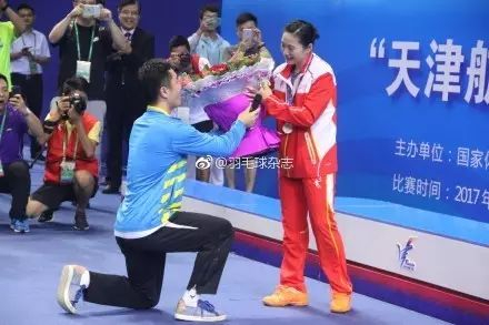 全运会羽毛球颁奖后,张稳向刚刚获得全运会女双冠军的女友骆羽求婚成功!
