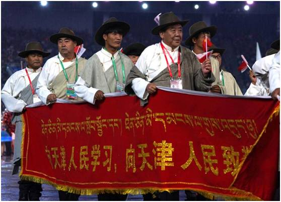 在全运会开幕式运动员入场环节,西藏代表团成员手捧洁白的哈达入场,他们还手持印有藏汉双语“向天津人民学习,向天津人民致敬”的红色横幅,引起全场雷鸣般的掌声,展现了西藏人民的热情和淳朴。