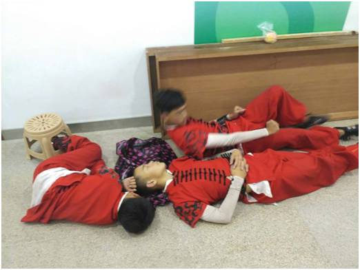 全运会开幕式上,600名身着红装的“功夫小子”以漂亮的拳脚招式赢得了满堂喝彩,这些十来岁的孩子全部来自于霍元甲文武学校,场外,小演员们就累得倒地睡下了。