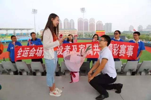 中建三局总承包公司天津体育基地项目综合工长杨亮亮,邀约女友一起去三局参建的场馆观看比赛。中场休息的时候,杨亮亮突然捧出99朵玫瑰,单漆跪地,向女友浪漫求婚。