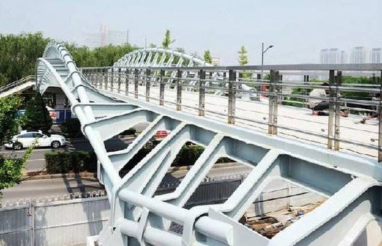 桥梁主梁全长65.6米,天桥的桥面宽4米,中间是3.5米宽人行道,两侧分别是栏杆,将在滨河东路人行道或汾河景区的绿地内增设上下口。