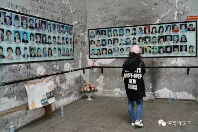 他们按照收藏的照片,在小镇上转了几圈,就是找不到那座废弃的学校,问了当地人,才在一条坑坑洼洼的路边找到了那所学校。废弃的教室外摆着花圈,有些凄凉。走进学校体育馆的一刹那,他们惊呆了,墙上挂满了遇难者的照片,最小的孩子才9岁,一双双天真无邪的眼睛无法直视,悲伤顿时笼罩全身。