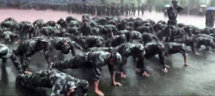 不同于有美女教官的郑州大学,昆明一高校在军训时突降暴雨,学校仍坚持让大家进行俯卧撑匍匐前进。