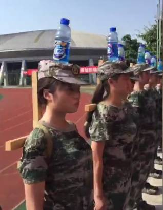 而在四川建筑职业技术学院中入选国旗队的女生接受的军训也令人新奇。在暴晒下她们头顶矿泉水,背贴木桩,手夹扑克,训练军姿。