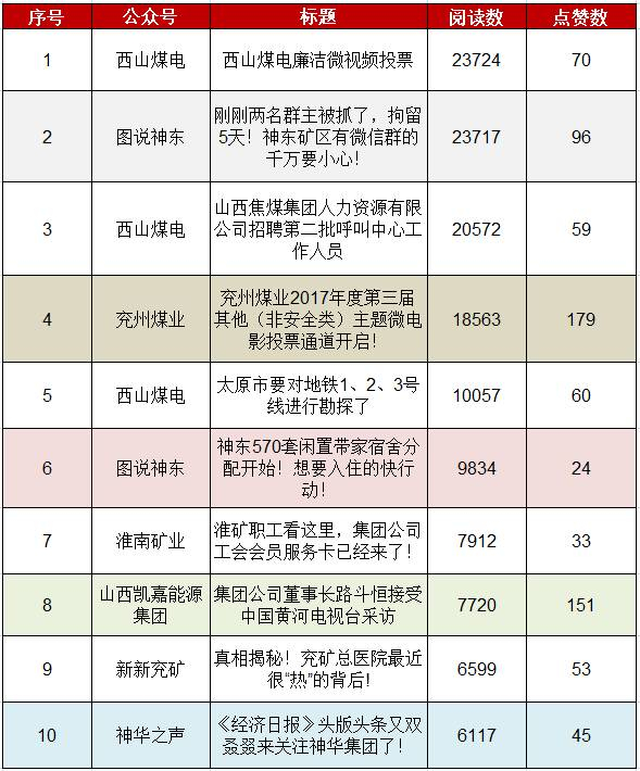 全国煤企榜单前十:西山煤电(持平)、图说神东(持平)、新新兖矿(+1)、神华之声(-1)、郑煤集团(+1)、兖州煤业(-1)、淮南矿业(+10)、黑龙江网报(+3)、河南能源(+3)、中国平煤神马集团(+6)。