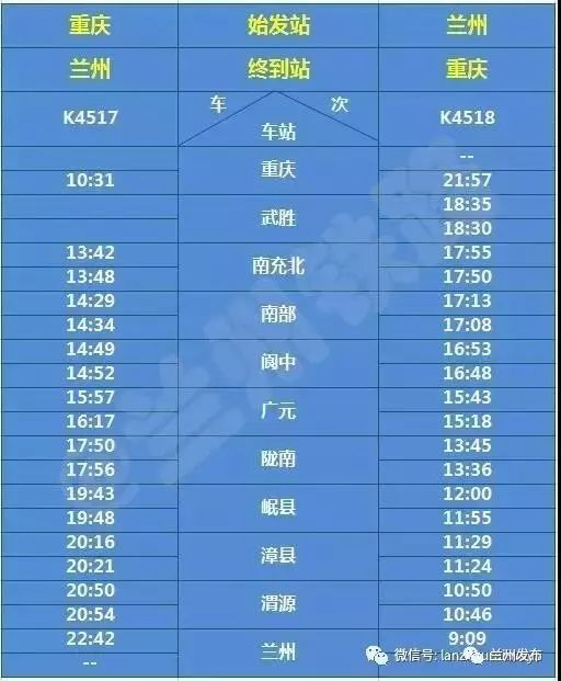 重庆至兰州K4517/8次旅客列车,重庆开车时间10:31,到达兰州时间为22:42,单程列车运行时间12小时11分钟,途经南充北、南部、阆中、广元、陇南、岷县、漳县、渭源等站。
