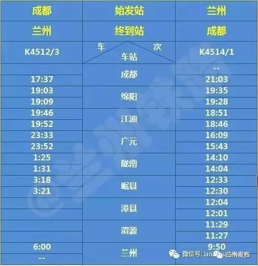 兰州至成都K4514/1、K4512/3次旅客列车,兰州开车时间9:50,到达成都时间为21:03,单程列车运行时间11小时13分钟,途经渭源、漳县、岷县、陇南、广元、江柚、绵阳等站。