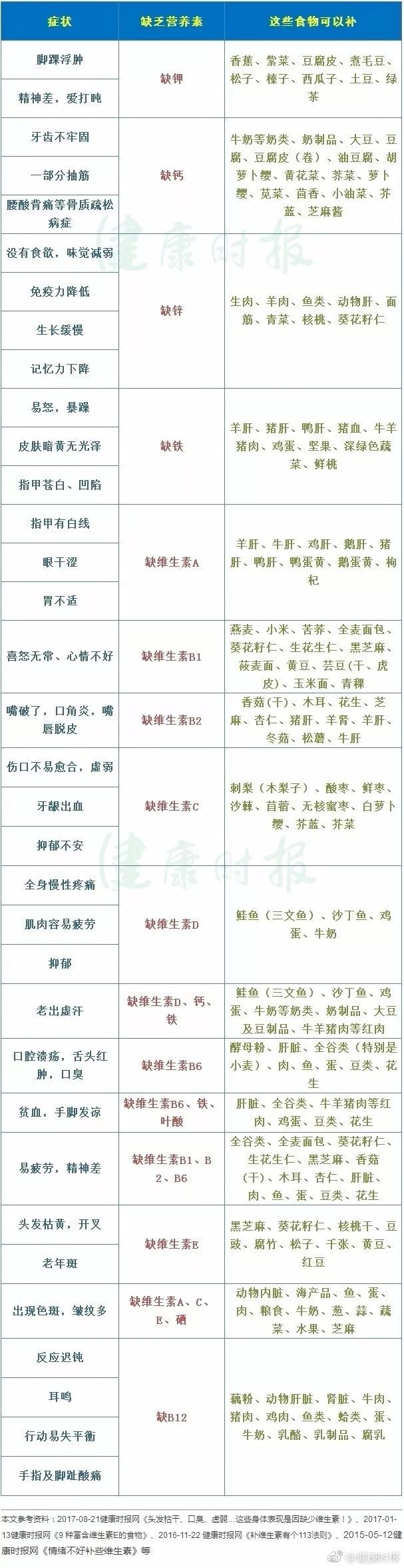 在排除器质性疾病之后,如果身体经常有以下不适,可能是缺乏某些营养素,如何改善?送你一张表格吧~(健康时报)
