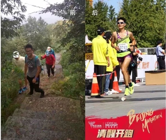 最开始跑五公里、十公里,慢慢加到二三十公里,到后来开始参加2015年的杭马半程用时1小时53分、千岛湖马拉松用时4小时54分……一直到北京马拉松成功破3。