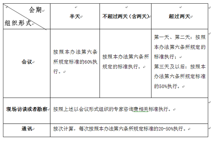 第九条 不同形式组织的专家咨询活动适用专家咨询费标准如下: