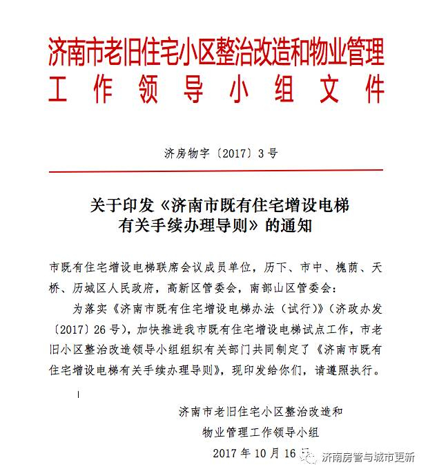 为加快推进我市既有住宅增设电梯试点工作,方便业主或委托人办理既有住宅增设电梯申请手续,根据相关法律法规和《济南市既有住宅增设电梯管理办法(试行)》等规定,制定既有住宅增设电梯有关手续办理导则。