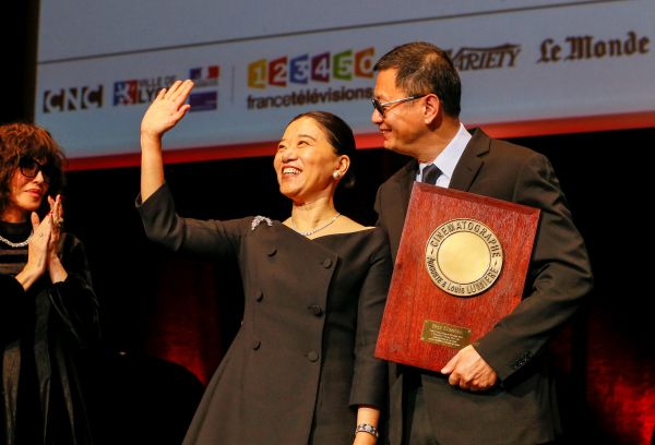 王家卫10月20日在卢米埃尔电影节上携妻子上台领奖。(路透社)