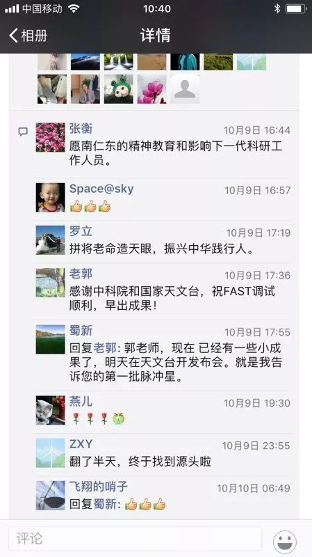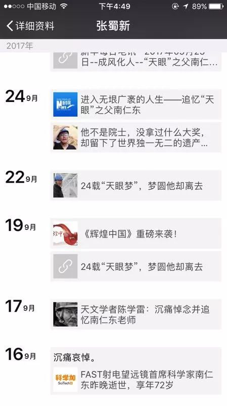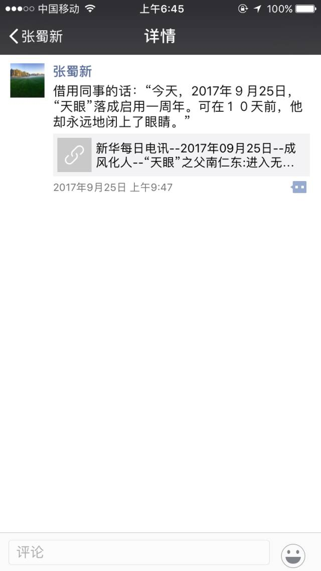 打开FAST工程副经理、中国科学院国家天文台射电天文研究部副主任张蜀新的朋友圈,“南仁东”和“中国天眼”这两个名字在最近一段时间里出现频率最高。