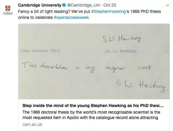 10月23日,为了纪念“开放存取日”,剑桥大学公开了霍金的博士论文。