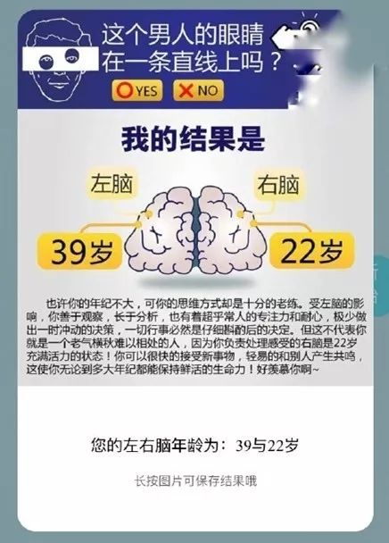 “这个男人的眼睛在一条直线上吗?我的结果是,左脑33岁,右脑5岁。”近日,一则关于左右脑年龄的测试“刷爆”朋友圈。有不少网友晒出自己的测试结果,并配上了一些调侃的文字。