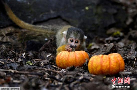 资料图:当地时间2017年10月26日,英国伦敦,伦敦动物园内的动物收到镂空的南瓜作为万圣节“礼物”。