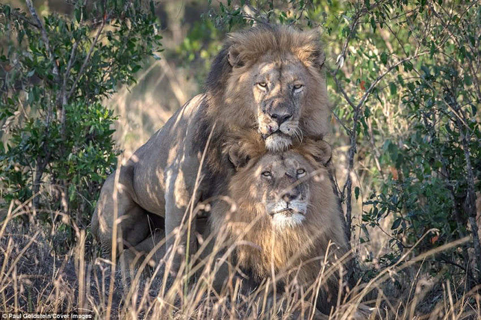 在肯尼亚的马塞马拉,野生动物摄影师抓拍到了两头雄狮之间的亲密瞬间。来自伦敦温布尔顿的保罗·戈尔茨坦说,他第一次在肯尼亚的马塞马拉观察到两头狮子的时候,两头狮子并排站着。在某一刻,一头狮子的头还靠着另一头狮子。