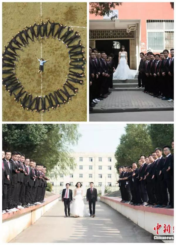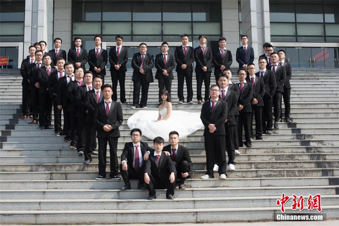 近日,@武昌工学院 14级机械制造五班拍摄了一组毕业照。全班共36名学生,但仅有一名女生。男生们众星捧月,簇拥着班里唯一的一名女生,在学校拍下一张张毕业照,留下青春的回忆。网友:这不是女生,这是女皇!(中新网)