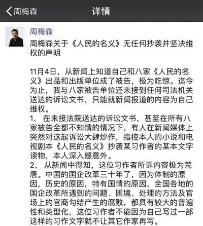 《人民的名义》被诉抄袭 编剧周梅森回应