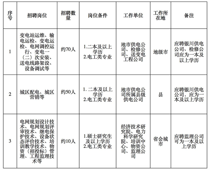 3. 本批次(第一批)招聘专业:电工类专业。优先招聘研究生、重点院校本科生。录用毕业生招聘岗位为生产一线技能岗位,并在分配的单位和生产岗位工作满足一定年限后,方可参加技术、管理岗位竞聘或申请跨单位调动。