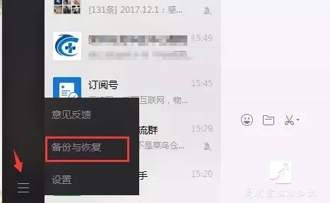 首先,在电脑上安装一个微信电脑版,登录后点击左下角的三横图标,再点击“备份与恢复”。