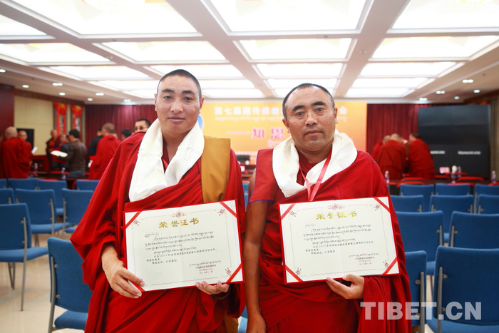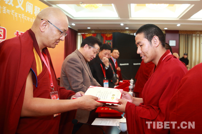 中国藏语系高级佛学院副院长南拉扎西向教义阐释优秀论文作者颁发证书。