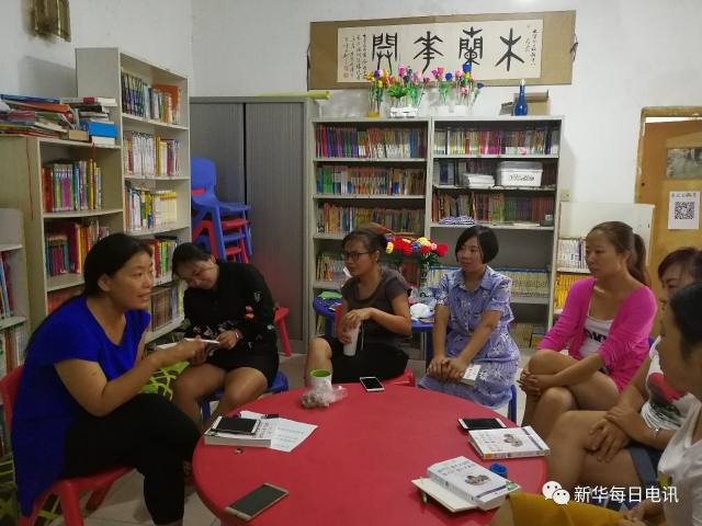 这是一排三连间的老平房。斑驳的墙体,红门框、绿纱窗,透出一股沧桑。屋子虽然简陋,但收拾得井井有条。中间读书室的墙上,挂着一幅篆字“木兰花开”。图书角放着文学书、育子书、历史地理书、科学普及书。书架顶上,一字排开,摆着打工姐妹制作的毛线花、泥塑花。空闲时候,大家围坐在桌边,一起读书,谈育子得失;一起做艺术品,增加经济收入。
