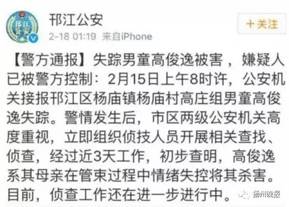 2月15日,邗江警方接到报案,说杨庙镇杨庙村6岁男孩高俊逸失踪!家人寻找无果,焦急万分。高俊逸的爷爷告诉民警,事发时孩子奶奶去买东西,妈妈上楼一会,孩子在楼下,妈妈再下楼时发现孩子已经不见了。