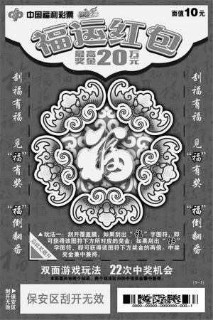喜欢福彩刮刮乐的彩民朋友们有福啦!新票“福运红包”登陆沈阳彩市,见福有彩,福“倒”好运翻番。 22次机会冲击20万元头奖 “福运红包”彩票采用双面刮开的印制新工艺,正面刮奖后再沿虚线揭开,彩民可再次获得刮奖机会。票面设计以喜庆红色为底,映衬书法百福图,见福有奖,福倒翻番,福运连连,红包满满,契合主题。该票面值10元,共有22次中奖机会,设8个奖级,最高奖金20万元。 该彩票共有两个玩法,两个玩法区内的中奖奖金兼中兼得。玩法一:刮开覆盖膜,如果刮出“福”字图符,即可获得该图符下方所对应的奖金;如果刮出倒“福”字图符,即可获得该图符下方所对应奖金的两倍。中奖奖金兼中兼得。玩法二:刮开覆盖膜,如果刮出任何奖金金额,即中该奖金;如果出现号码“66”,即可获得50元奖金;如果出现号码“88”,即可获得100元奖金。中奖奖金兼中兼得。 婚庆主题彩票 “喜加福”热卖沈城 除了新上市的“福运红包”,之前刚刚亮相沈城的婚庆主题彩票“喜加福”同样受到彩民朋友的喜爱。 刮刮乐“喜加福”为套票,全套6枚,其外形沿用“五福临门”彩票的异形红灯笼形状,将其融入婚庆主题,题材选取传统中式婚礼吉庆画面,并分别冠以与婚恋相关的“永结同心”、“心心相印”、“喜结良缘”、“缘定今生”、“龙凤呈祥”、“早生贵子”喜庆祝福语,既凸显出浓浓的中国传统文化气息,又具有纪念意义,特别适合婚礼现场作为伴手礼赠送亲朋。刮刮乐“喜加福”面值5元,共设10个奖级,最高奖金10万元。票面与游戏相互融合,相得益彰,玩法简单明了,共有两个玩法,两个玩法区内的中奖奖金兼中兼得。 玩法一:刮开覆盖膜,如果刮出任何奖金金额,即可获得该奖金。中奖奖金兼中兼得。 玩法二:刮开覆盖膜,如果刮出“囍”或"福"图符,即可获得该图符下方所对应的奖金。 |